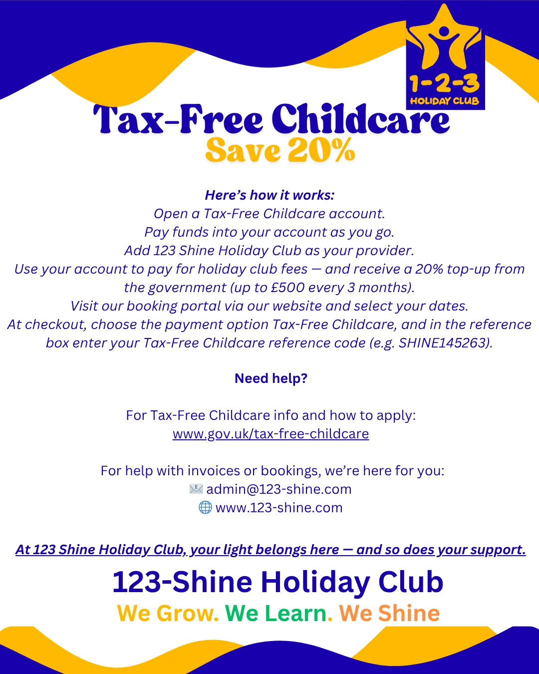 If you are using Tax-Free Childcare, please contact us within 3 days of making the payment to provide your reference number and booking details, so we can confirm your payment and finalize your booking. This step is essential to ensure your booking is secured.