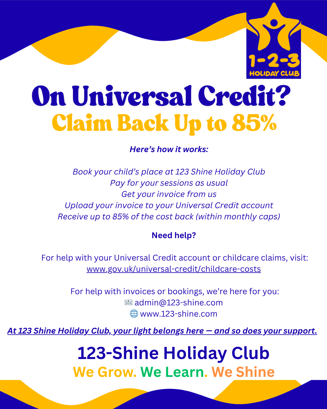 We accept Universal Credit towards the cost of your bookings. You will need to make full payment for your booking via our portal as usual. You can then submit your claim to Universal Credit for reimbursement.